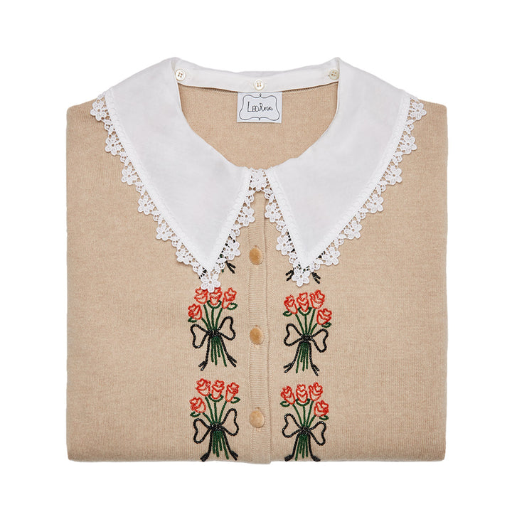 Antonietta Cardigan N002 is a full-length sleeve cardigan made from 70% merino wool and 30% cashmere, with a beige body, hand embroidered rose motifs, beige velvet buttons and a 100% cotton white collar with floral macramé. |