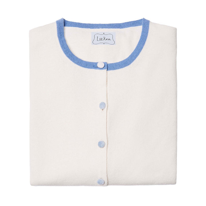 Rosa Cardigan N009 is a full-length sleeve cardigan made from 70% merino wool and 30% cashmere, with a white body, and light blue collar, light blue velvet buttons, and white velvet top collar button. |