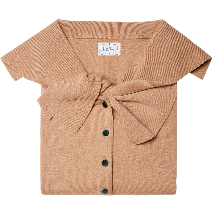 Romy Cardigan N002 is a full-length sleeve cardigan made from 70% merino wool and 30% cashmere, with a camel body, camel bow collar, and forest green velvet buttons. |