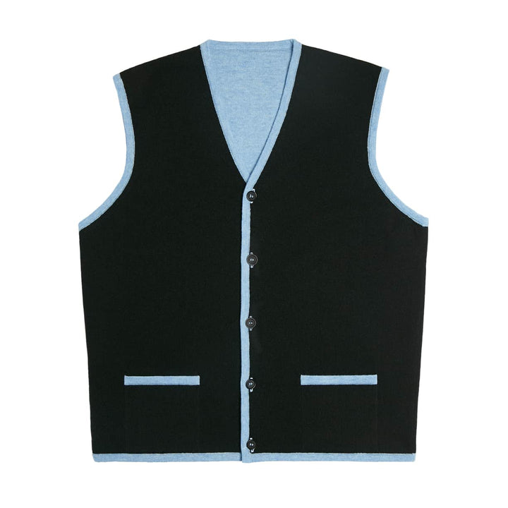 Gio Gilet N008 is a reversible men's gilet made from 100% double layer lambswool. The front side of the gilet with a black body and light blue trim can be reversed to a monochrome light blue body. The detachable corozo buttons in black and light blue are also designed to be reversible.