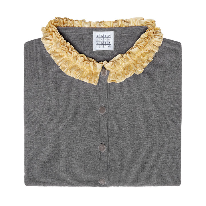 In collaboration with Super Yaya. Therese Cardigan N001 is a full-length sleeve cardigan made from 70% merino wool, 30% cashmere, with a grey body, yellow ruffles, and grey velvet buttons. |