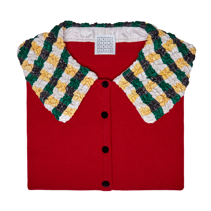 Yaya Cardigan N001 is a full-length sleeve cardigan made from 70% merino wool, 30% cashmere, with a red body, multicolored patchwork collar, and black velvet buttons.
